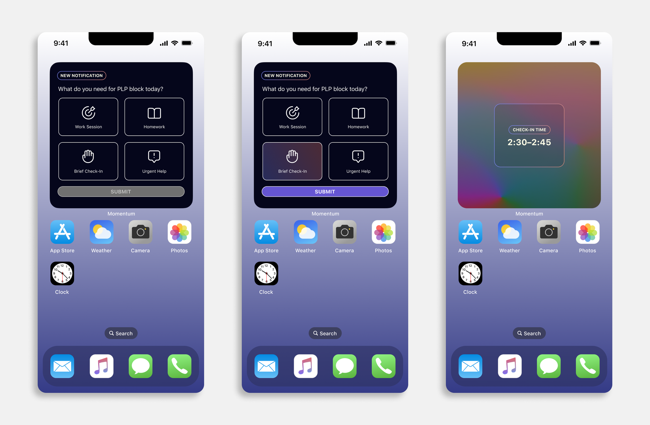 The simple usability of widgets aligned well with our intentions to create a non-laborious solution for students. At the start of each PLP block, students are notified to fill out a form to let the teacher know how they plan on spending the PLP block. If the student chooses to meet with the teacher, they will receive an estimated check-in time on their widget.